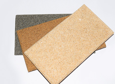 微粒材料是一種新型綠色裝飾材料,具備優異的聲學性和物理性能。該材料是以天然砂?;蚪洯h保處理的固廢顆粒為骨料,以環保膠凝劑,通過壓振工藝,生產的具有大量相互連通的微小空隙的多孔材料。
